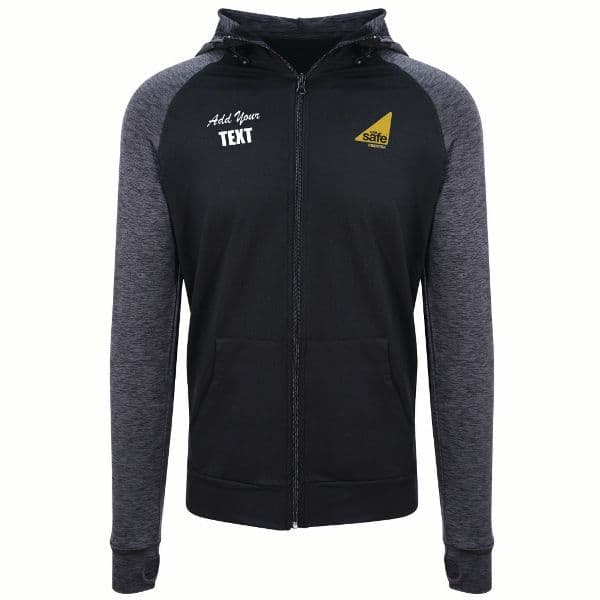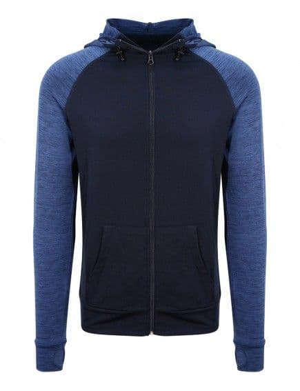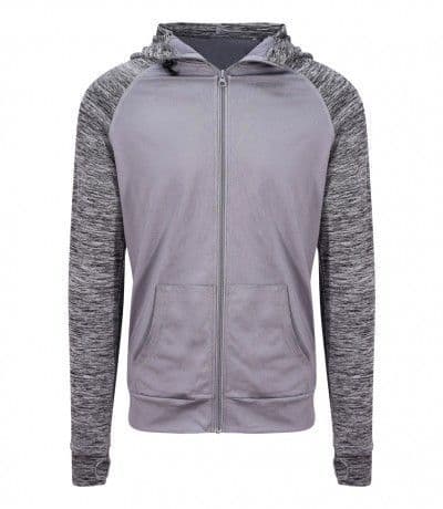 This cool sports hoodie combines wicking performance with lightly brushed fabric on the body. Adjustable attached hood protects from the elements while the raglan sleeves and thumb holes offer great range of motion.