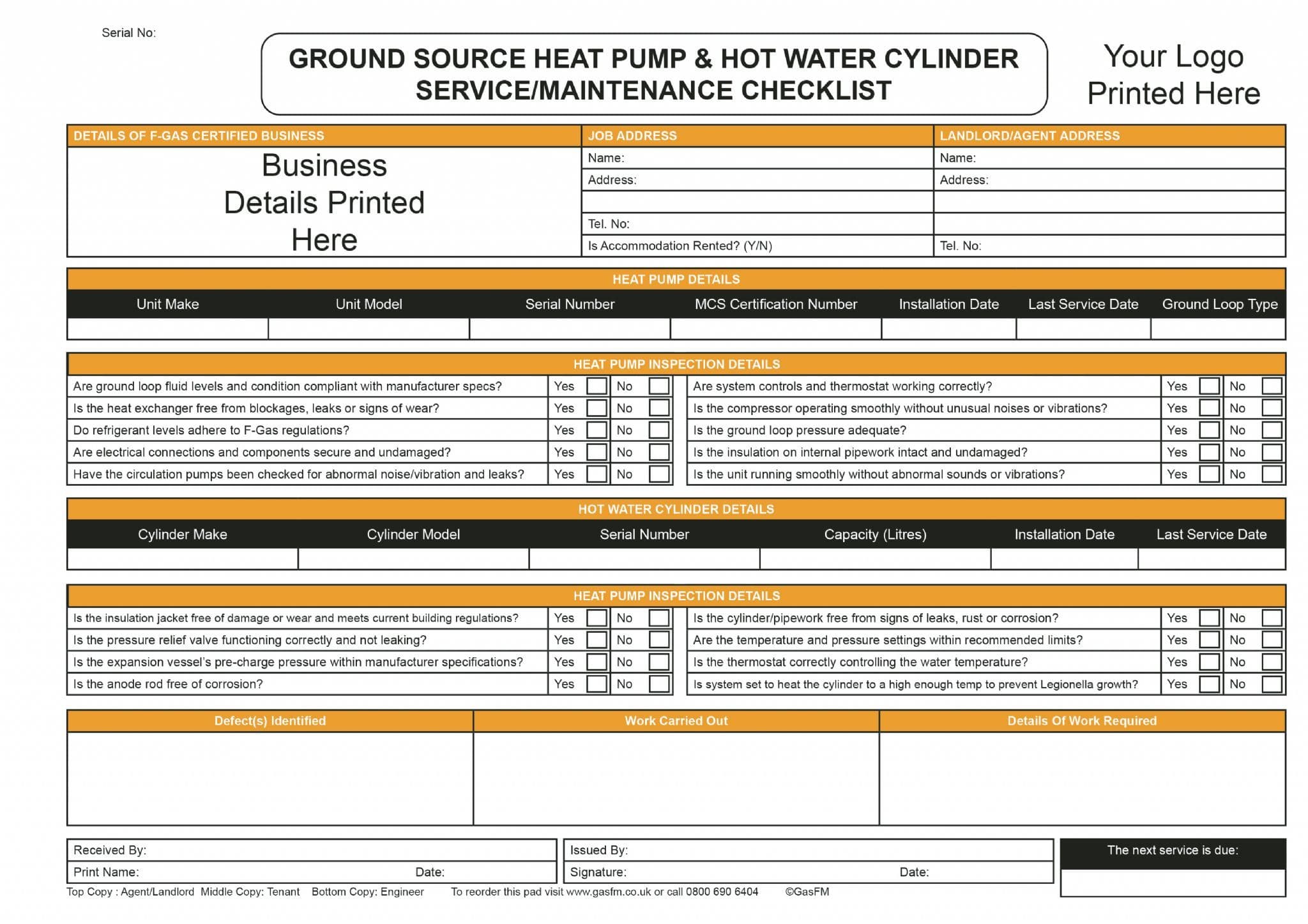 Used to record the safety checks carried out during a ground source heat pump service/inspection, each form benefits from having a unique serial number, enabling you to track your work.